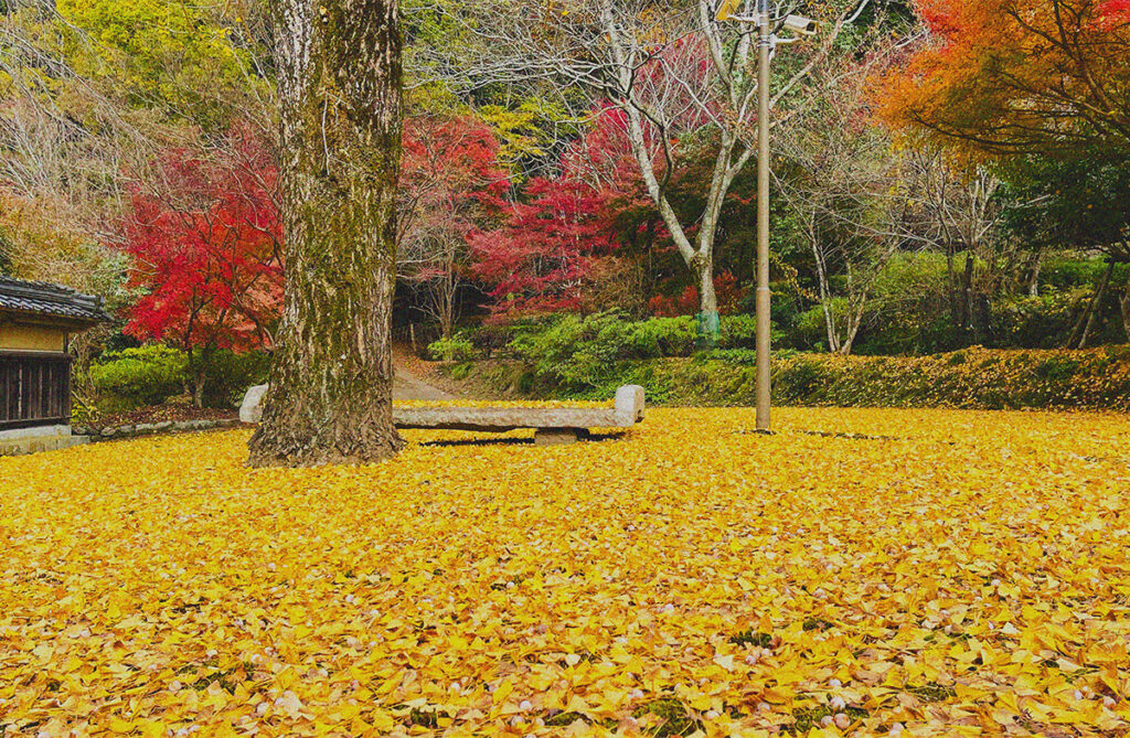 こちらも紅葉が見事で、地面一面に広がる赤や橙の絨毯はまるで絵画のよう。